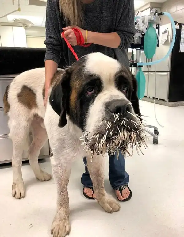 Некоторые собаки не всегда осознают опасность встречи с различными дикими животными. К примеру, этот сенбернар точно и представить себе не мог, что так закончится его встреча с дикобразом, и что ему потребуется неотложная ветеринарная помощь. Сразу хотим предупредить, далее фотографии не для впечатлительных.