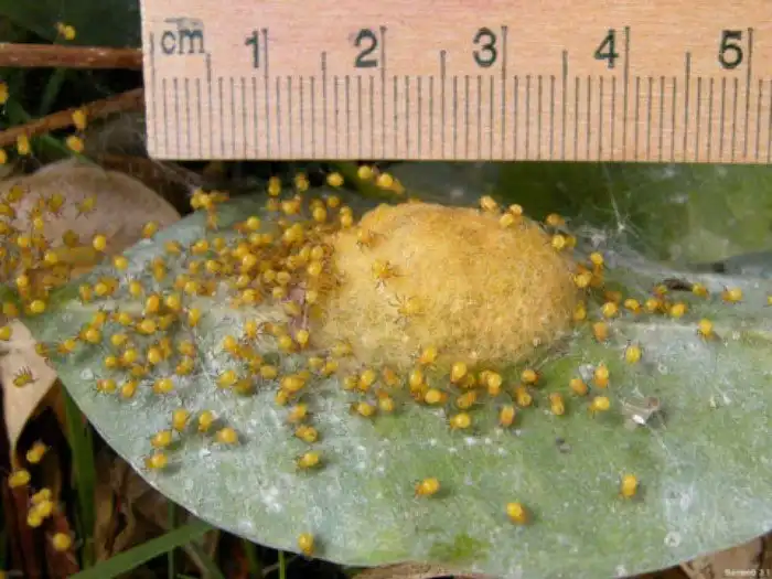 Одинокая мать делает здоровые ясли в виде кокона на внутренней стороне листа недалеко от паутины и сажает туда от 100 до 260 яиц. После этого спокойно отправляется в мир иной к своему возлюбленному. В зимний период кокон приоткрывается, свежеиспеченные пауки вылезают. А через пять недель уже переезжают на собственную жилплощадь, а цикл повторяется.