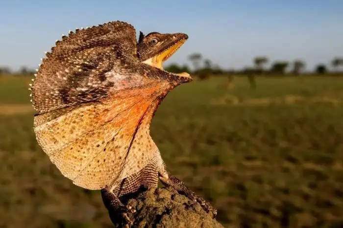Обычно эта штука находится в сложенном положении. По плащу радиусом 30-40 см проходит множество кровеносных сосудов, а предназначений у перепонки очень много. Для начала вспомним, что хладнокровным рептилиям надо с утреца немного посидеть на солнышке, чтобы прогреть свое чахлое тело. Вставая под солнце и распушая свою перепонку, время нагрева тела снижается в несколько раз, и у зверя останется дополнительное время на фитнес и саморазвитие (или чем там еще занимаются современные рептилии).