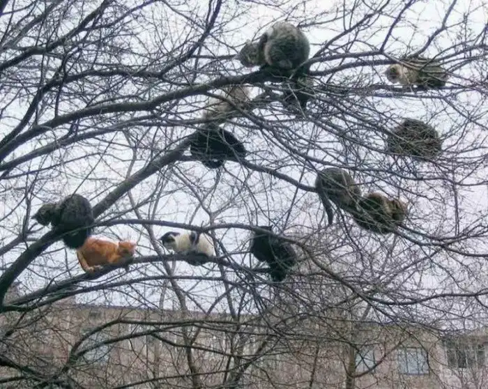 Наступила календарная весна, и птицы потянулись обратно домой. Но, пока они в пути, их излюбленные места занимают коты. Деревья, гнезда и кормушки — всюду они. Понять, почему котики выбрали именно эти места, сложно.