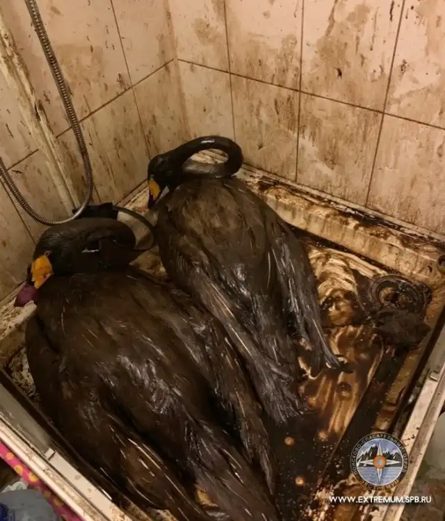 Два лебедя-кликуна оказались в непростой ситуации, когда во время перелета они приводнились на мазутный отстойник одной из ТЭЦ. Это был отстойник, полностью заполненный теплой водой с отработанными веществами. На место происшествия сразу же вызвали службу спасения животных.