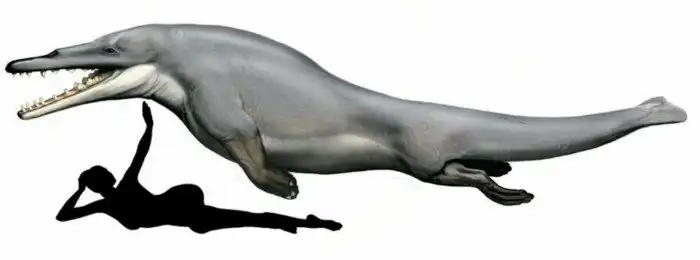 Далее идут базилозавры и дорудонтиды. Они выглядели почти как нормальные киты, ведь имели хвостовой плавник. Но имели мелкие задние конечности для поддержки партнера во время спаривания и крохотный мозг. А еще они не могли в эхолокацию, как современные киты.