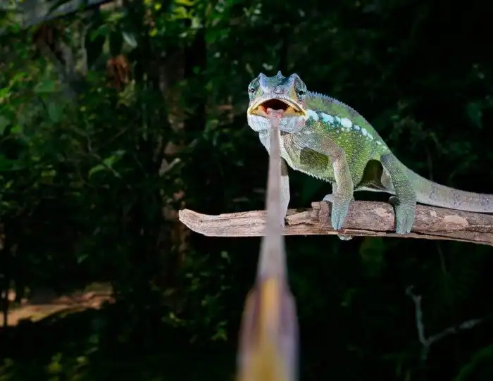 Теперь поговорим о том, как хамелеон охотится. И тут он является самым быстрым стрелком на диком западе. Клинт Иствуд нервно курит в сторонке, ведь язык хамелеона выбрасывается на свою максимальную длину (а это почти как длина тела, если не больше) за 1/20 секунды, после чего возвращается в кобуру примерно за 0,5 секунды. Таким образом, путем несложной математики, которую ты, конечно, не выучил, можно сказать, что хамелеон за 3 секунды может делать до четырех убийств.