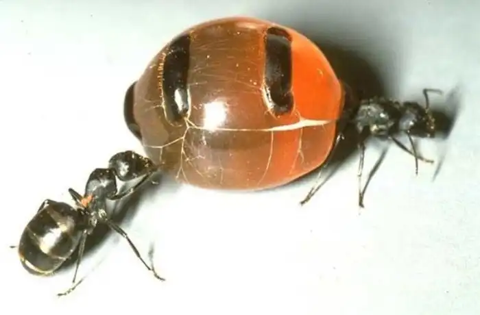 Как же заполняют эти бочонки? Помогают им в этом муравьи-рабочие. Как и другие представители своего семейства, наши гости успешно эксплуатируют тлю. Нежными поглаживаниями они стимулируют насекомое выделять сладкую росу — результат питания соком растений. Её и отправляют на хранение в живые банки. Чтобы донести питательные вещества в кладовую, работяга съедает столько, сколько может и отправляется прямиком в гнездо. Методом рот в рот он кормит особых муравьёв-запасчиков, набивая их эластичное брюшко. Если ты считаешь, что тебя используют, то вспоминай о живых резервуарах с едой, чья цель — быть консервной банкой для всей колонии.