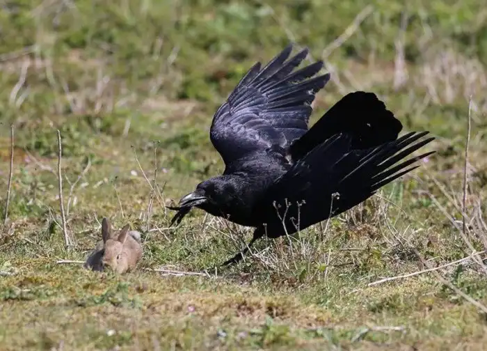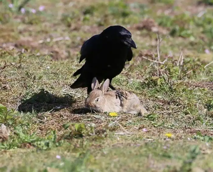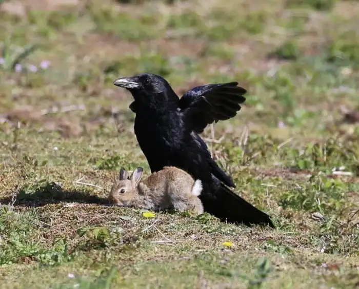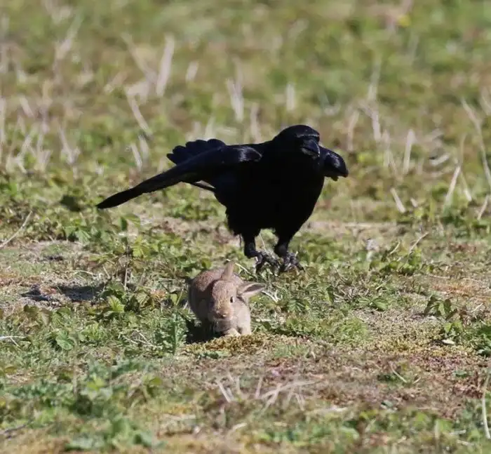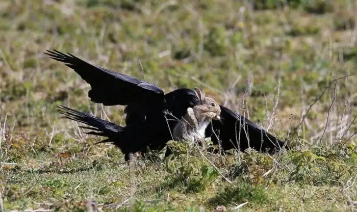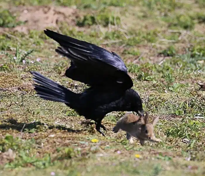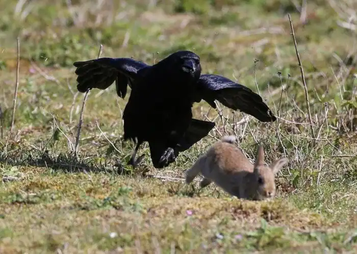 74-летний фотограф дикой природы сумел запечатлеть пусть и не уникальное явление, но зато так, что оно впечатляет всех. А началось все с того, что голодная большая ворона решила пообедать маленьким крольчонком.