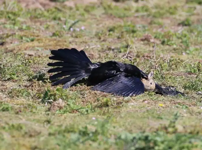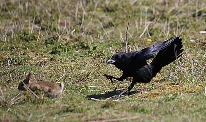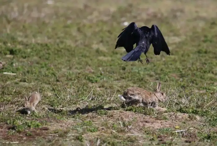 Но вместо того, чтобы спрятаться в нору, перепуганный малыш бегал кругами и ворона вновь пошла в атаку. Другой палки у фотографа не было и он понимал, что не успеет помешать. Но тут, к счастью, на шум выскочила взрослая крольчиха и бросилась на птицу. Она отгоняла её до тех пор, пока крольчонок не сумел спрятаться в норе.