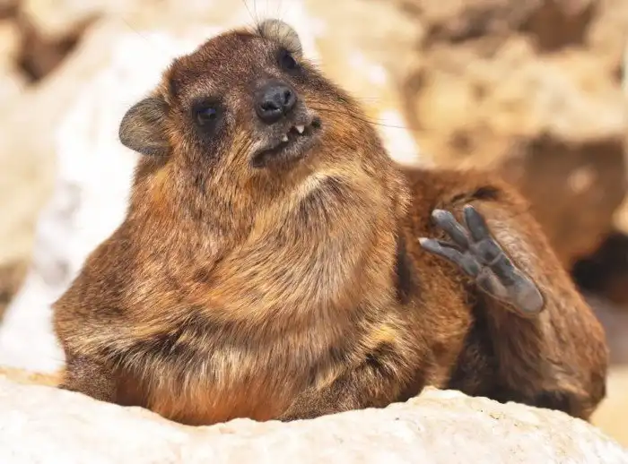 Сами лапы устроены, как у копытных и хоботных – опять привет слонам – с когтями, которые напоминают копытца. На подошвах – резиновые подушечки, которые постоянно влажные из-за секреции потовых желез, как думаете, зачем? Лазать, конечно! Лапа – сводчатая изнутри и мокрая, работает, как присоска – вспомним об осьминогах, да-да. Поэтому по скалам даманы скачут, очертя голову, в том числе и вниз головой.