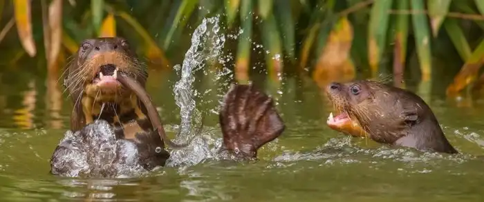 Крупную добычу животные убивают толпой. Сила и наглость позволяют Выдрам охотиться даже на кайманов, аллигаторов и анаконд. Эти ребята настолько уверены в себе, что без труда нападают на ягуара — крупнейшего хищника Южноамериканского континента. Не верите? Смотрите сами!