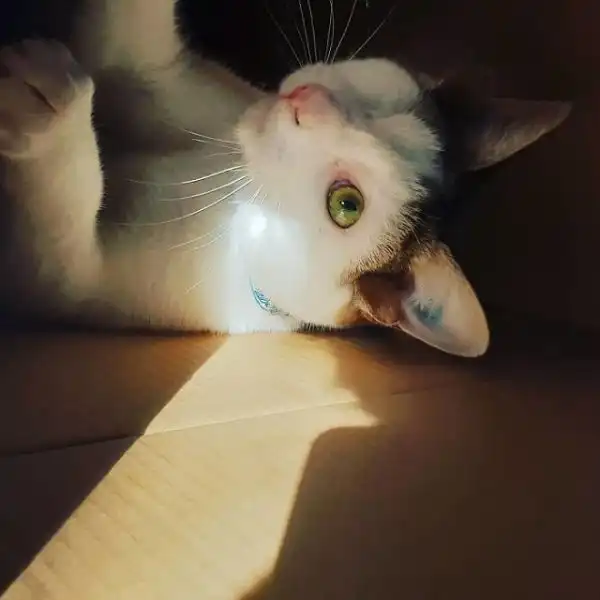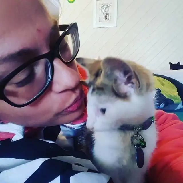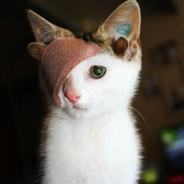 Одному коту пришлось провести операцию по удалению глаза, поскольку он был поражен инфекцией. Так он получил кличку Франкенкиттенс, а сокращенно просто Фрэнки. Вполне очевидно, что одноглазого и четырехухого кота вряд ли кто-то захочет приютить. Поэтому сотрудница приюта Джорджи Андерсон взяла Фрэнки домой, что тот мог прийти в себя после операции, но в итоге она так к нему привязалась, что решила оставить его у себя насовсем.