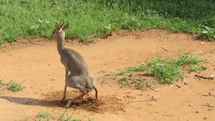 Особенность заключается в том, что «новобрачные» должны выбрать себе территорию, на которую всем, кроме них, вход воспрещен. Для того, чтобы все в округе понимали, какие площади облюбовали влюбленные, самка мочится по периметру на камни. Но, как выясняется, этого мало, и тут за дело берется глава семейства. Самец начинает разрывать землю в тех местах, где мочилась самка, и мочится туда еще раз. Любые выступающие части, например камни, самец метит выделениями из предглазничных желез. А чтобы уже наверняка было понятно, что здесь живет антилопья семья, он по периметру участка оставляет свои фекалии (к счастью, не за один раз).