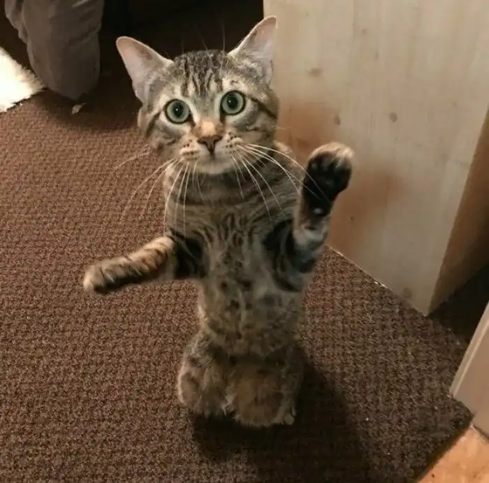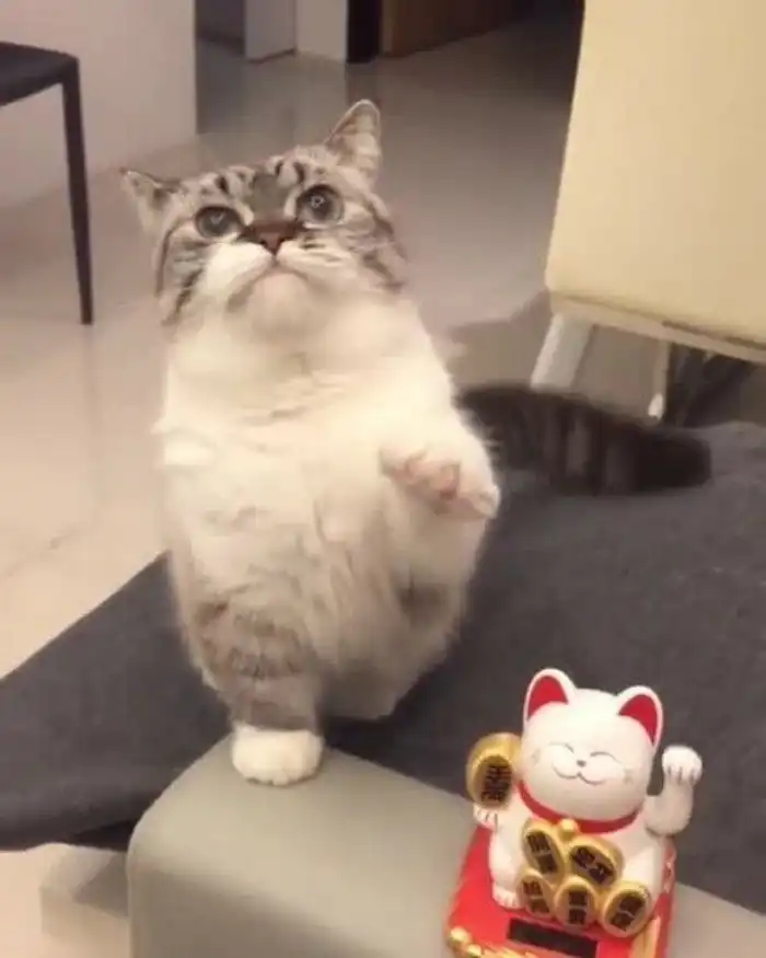 Он заметил, что статуэтка машет лапой, и решил попробовать тоже