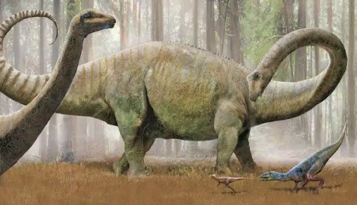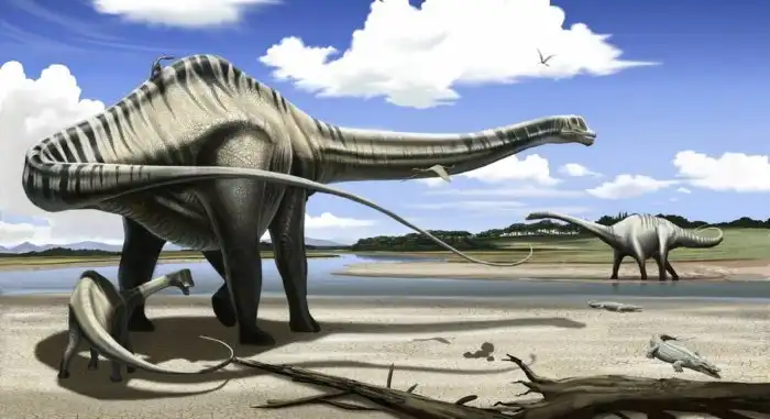Итак, наш гость относится к группе зауропод — длинношеих растительноядных динозавров, появившихся около 210 млн лет назад (поздний триас). Их предки были юркими и относительно мелкими созданиями. Деды великанов бегали по пустынной Пангее (сверхконтинент) и не комплексовали насчёт своих размеров. Видимо, знали, что их потомки с лихвой всё компенсируют.