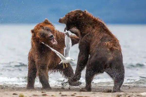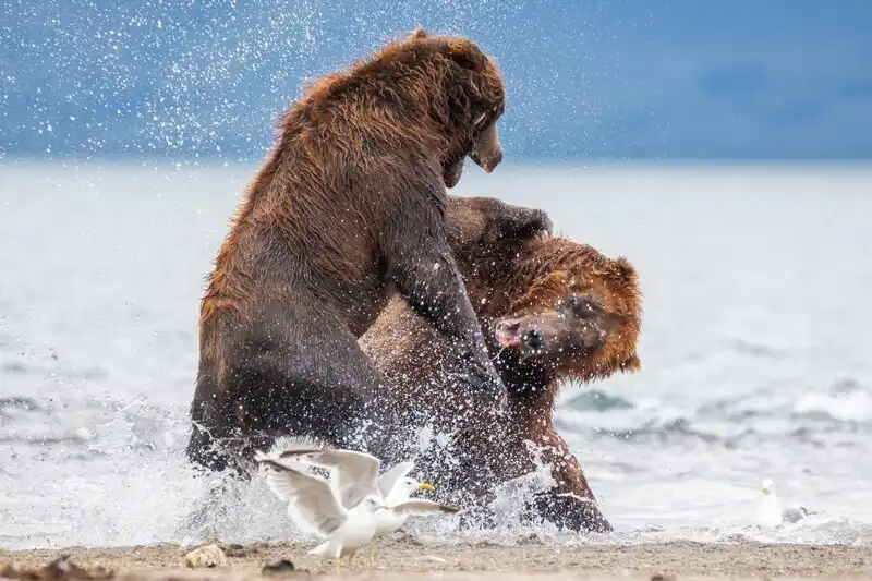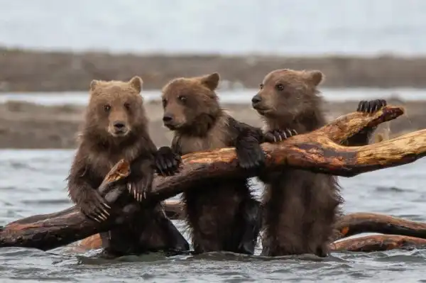Свидетелем драматических событий стал 36-летний фотограф Денис Будков в Кроноцком природном заповеднике на востоке России. Медведица с тремя медвежатами спокойно искали рыбу в реке, когда к ним направился агрессивный самец.