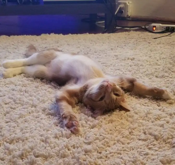 «Забрал кошку из приюта, и я не думаю, что она когда-либо видела ковер. Она лежала так примерно 30 минут без движения»