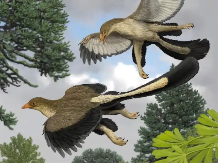 Тот самый четырёхкрылый оперённый динозавр. Очевидно, что перья на задних конечностях животина использовала исключительно для полёта.