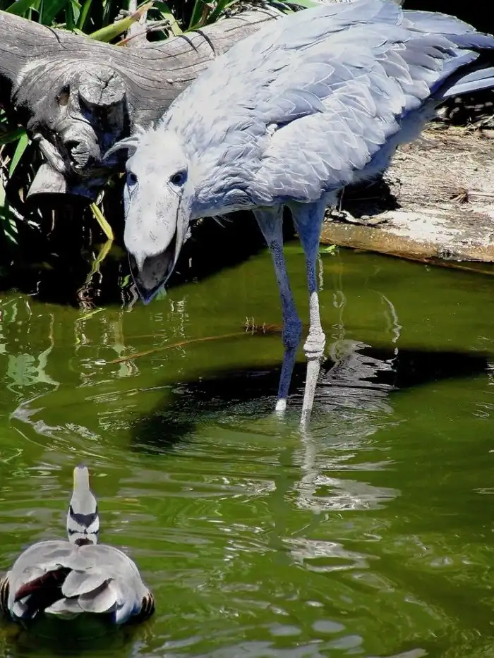 Но всё это мелочи. А вот что на мелочь не похоже — так это клюв нашего гостя! Массивный агрегат сразу бросается в глаза. Оно и не удивительно, по длине бандурина не меньше 23 см, а её ширина практически равна ширине тела птицы. Этой дурой китоглав ловит себе пищу: рыбу, земноводных, змей и даже маленьких крокодильчиков. Англичане насмешливо сравнивают клюв птахи с деревянным башмаком. Только вот этот «башмак» способен проломить панцирь черепахи, так что череп шутников расколется и подавно.