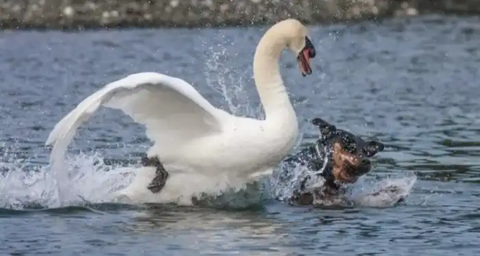 Тщательно следите за своими питомцами на берегу! Лебеди могут серьёзно их покалечить!