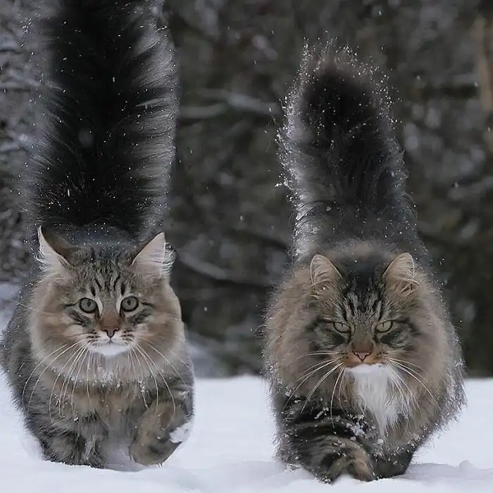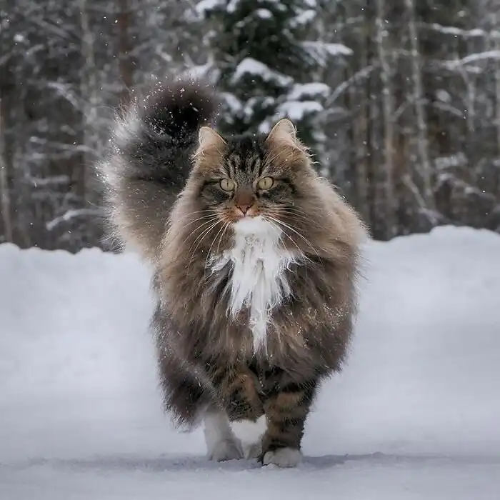 Чем больше и пушистее кот, тем больше хочется его тискать. А этих шикарных котов хочется затискать прямо через экран! Эти пушистые красавцы - четыре кота норвежской лесной породы, которые живут с хозяйкой в Северной Финляндии. Особенно шикарными эти котяры становятся зимой, когда их богатая шерсть распушается, и они отправляются на зимние прогулки - резвиться и прыгать по сугробам. Таким котам и сибирские морозы не страшны.