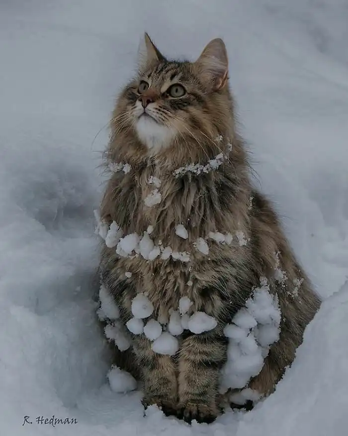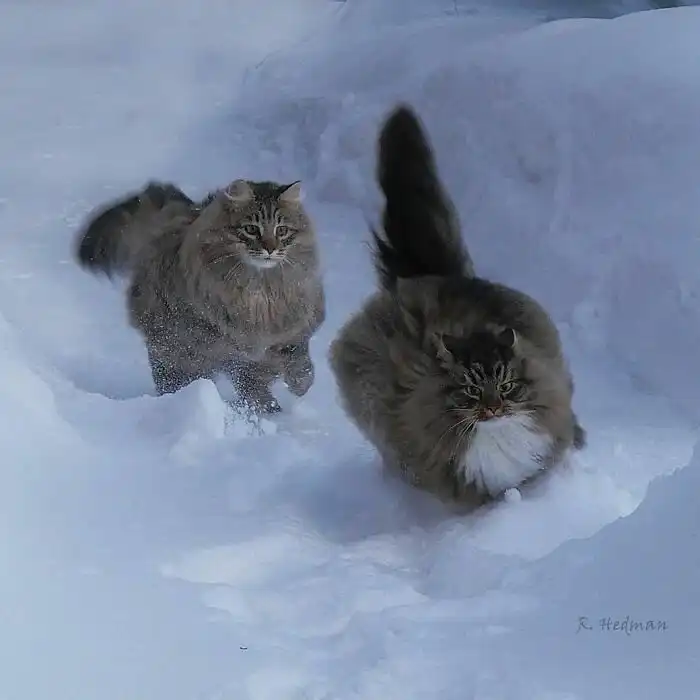 По рассказам хозяйки, все четыре кота - частично представители породы норвежская лесная или ее вариаций. Она обожает выводить своих питомцев на прогулки, а особенно веселыми прогулки получаются зимой. Пока пушистики резвятся, дурачатся и играют среди сугробов, Риикка не упускает шанса их пофотографировать. Взгляните на шикарные снимки с участием ее котеек: