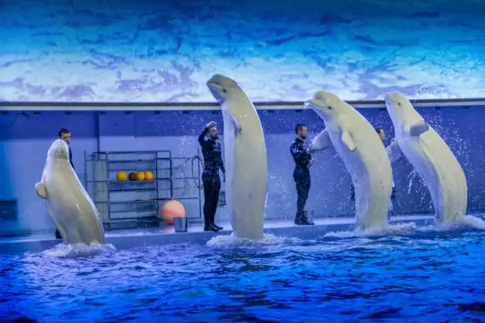 Белухи отлично поддаются дрессировке. Их частенько можно встретить в океанариумах и дельфинариях в качестве выступающих.