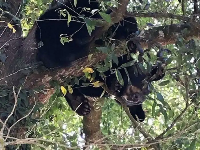 Официальные лица заповедника во Флориде сообщили, что дикий медвежонок попал в очень сложную ситуацию, когда оказался на дереве над загоном тигра.