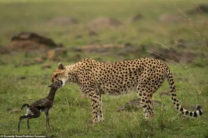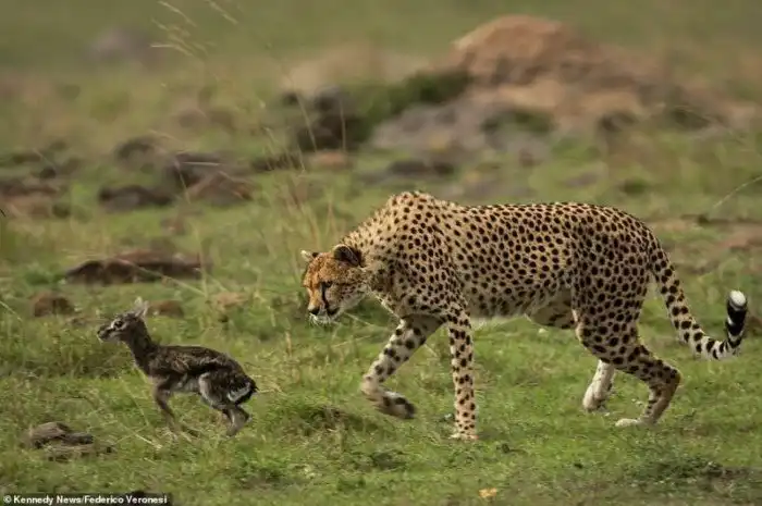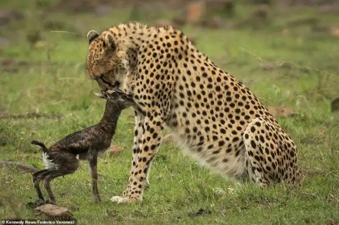 Фотограф дикой природы Федерико Веронези поймал удивительный момент: самка гепарда на мгновение приняла детеныша газели за своего собственного и "поцеловала" его. Прямо перед тем как съесть.
