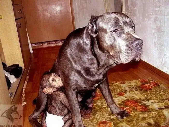 Маленького шимпанзе решил взять к себе на передержку один из работников этого зоопарка. Он не много переживал по поводу того, как детеныш поладит с огромной собакой, которая жила у мужчины в доме. Но решил рискнуть.