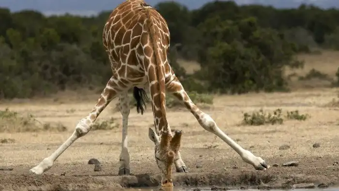 Во время водопоя пятнистый также уязвим. Дотянуться до земли, несмотря на длину своей шеи, жираф не способен. Поэтому животине приходится учиться азам балерунского искусства — растяжке и пластике. Пока несчастный жираф стоит в раскоряку у водопоя, растянувшись на шпагате, враги во всех смыслах, угрожают его заднице.