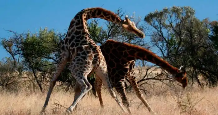 Драки в таких стадах — не редкость. Старшие особи регулярно устраивают трёпку молодняку, для профилактики. В брачный период бои становятся куда жёстче. Главное оружие в ритуальных сражениях... жирафьи головы. Раскрутив башку как следует (благо, что шея позволяет), бойцы дубасят друг друга рогами, которые уже не кажутся такими уж безобидными.