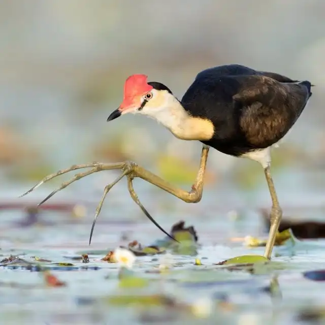 Это гребенчатая якана. Когда стоит в воде, кажется, что это обычная милая птичка. Но стоит ей показать свои лапки, то становится немного жутко.