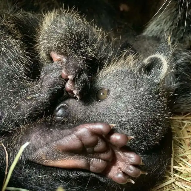 А это бинтуронг и они во многом похожи на людей. Когда у них хорошее настроение и они чувствуют комфорт, то животные начинают "хихикать". А если им перепадет угощение с большим содержанием сахара, то они ненадолго сходят с ума, прямо как дети.