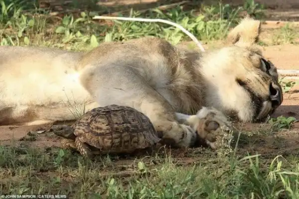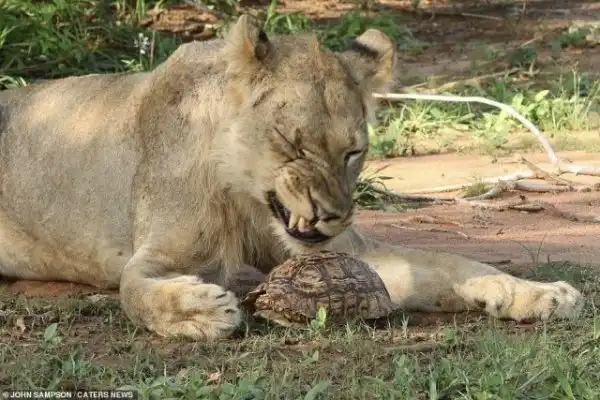 В Парке Замбии львица поймала черепаху и решила ей полакомиться, но не тут то было.