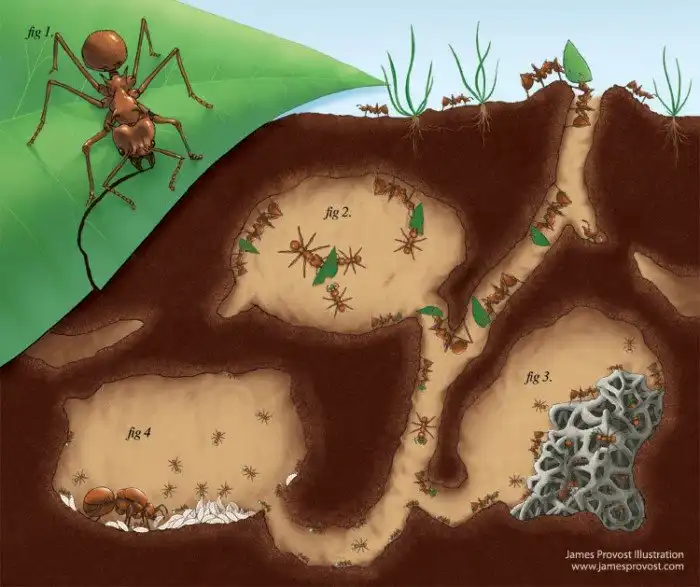Для каждого вида деятельности у муравьёв есть специальные камеры отсеки. Одна камера-ясли, другая камера для королевы, третья для мусора и так далее.
