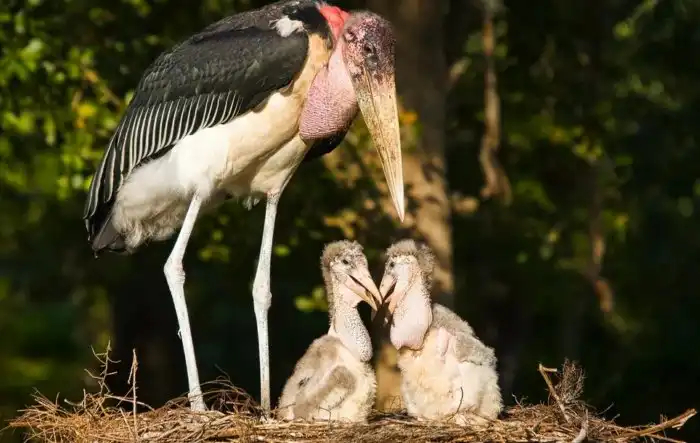 Птенчики у парочки появляются в самый разгар сезона засухи. Казалось бы, худшего времени для выведения потомства и не придумать. Но пока все страдают от жажды и мрут как мухи, марабу достают вилку, ножик и устраивают пир на весь мир как для себя, так и для своих деток. Поначалу родители приносят птенчикам живых зверушек. Но через 4 месяца ребятишки дербанят мертвичинку наравне со стервятниками и грифами.