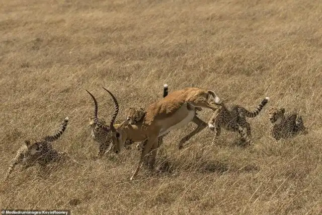 Однако у мощного самца импалы были другие планы. Могучим усилием он сбросил с себя гепардов и кинулся бежать от уставших хищников.