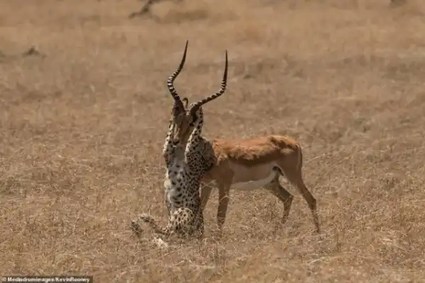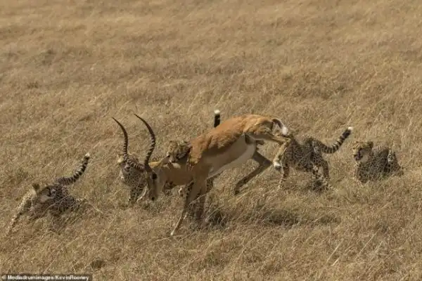 Редкий случай удалось заснять британскому фотографу Кевину Руни в кенийском национальном парке Набоишо. Самец импалы, которого атаковали сразу пять гепардов, вопреки всему сумел вырваться на свободу!