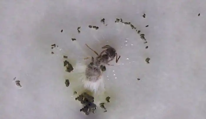Люди опрыскали нескольких ни в чём неповинных ребят заразным грибком-паразитом (Metarhizium brunneum). Симптомы болезни проявляются в течении 2 дней. Грибок, внедрившись в тело муравья, начинает распылять споры, угрожая всему муравейнику. Если этих спор в воздухе будет мало, то насекомые выработают иммунитет и победят заразу, если много, то заразятся все. Так как муравьи — существа очень социальные, риск уничтожить всю колонию необычайно высок.