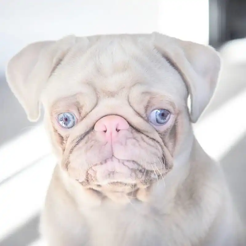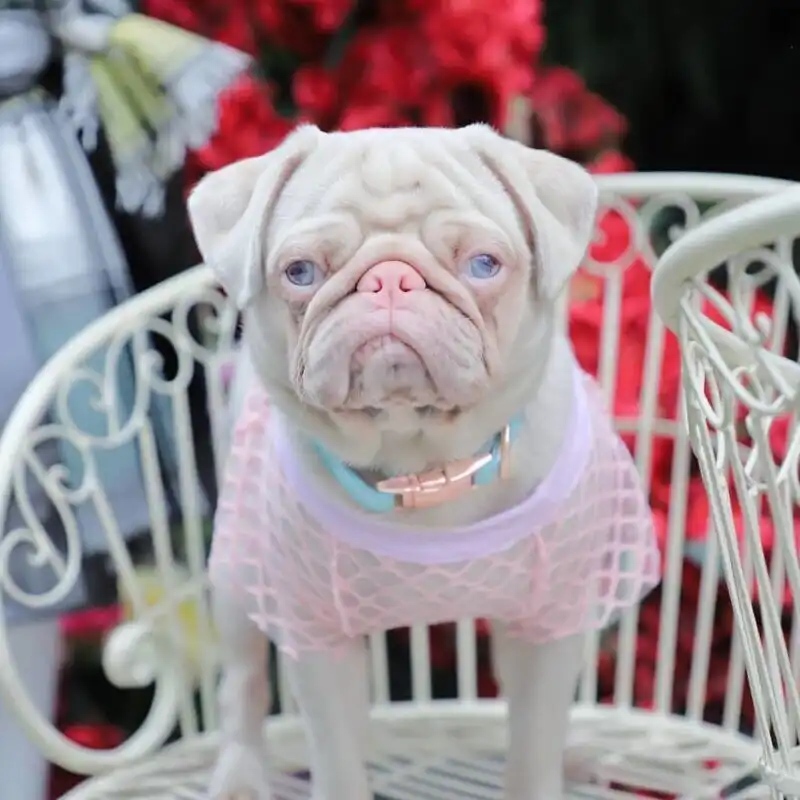 Мопс с нежным именем Милкшейк (Молочный Коктейль) собрал в своем Инстаграм-аккаунте уже более 75 тысяч подписчиков. Любителей собак привлекает его необычная внешность: у пса слегка розоватый мех, нос и лапы, а также очаровательные голубые глазенки - как у ребенка. Таких мопсов-альбиносов во всем мире не больше ста.