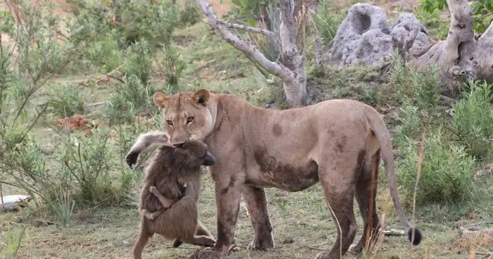 Умом и сообразительностью отличаются бабуины. Африканские обезьяны часто страдают от нападок кисок: львов и леопардов. Но и сами приматы могут представлять для них нехилую угрозу. Ведь за своих собратьев они мстят, воруя у королей саванны котят.
