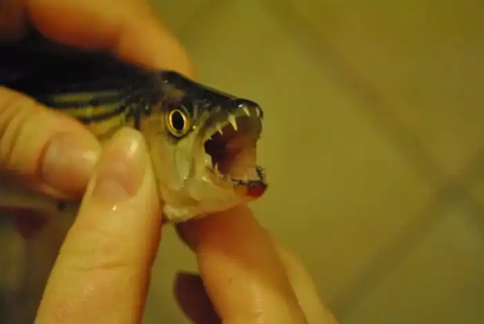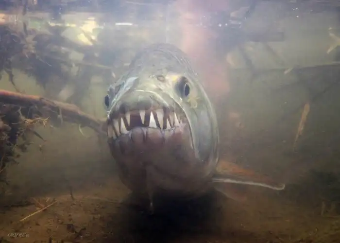 Во-первых, тянуть рыбёху будет тяжело — как-никак 50 кг на удочке. Во-вторых, тянуть придётся долго — попробуй засунуть в лодку двухметровую дуру. Если вы, всё же, затащили этого беса к себе на борт, держите конечности подальше от мордашки своего улова. Пасть из 32 острых зубов длинной в 3 см не прощает ошибок.