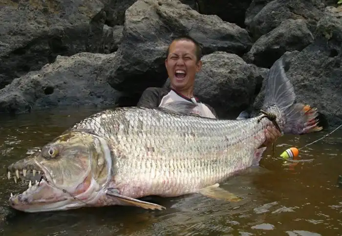 Местные прозвали ее мбенгой или гигантской водяной собакой, научно же рыбёха зовётся тигровой рыбой Голиаф. Чтобы не сомневаться, она ли попалась вам на крючок, постараюсь описать ее как можно красочней, ибо во время рыбалки на этого монстра времени полюбоваться на него у вас не будет.