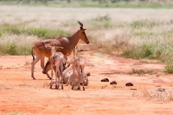 Через 8 месяцев антилопа становится мамочкой. Спустя пол часа новорождённая малявка уже может сосать молоко, а еще через час – кочевать вместе со стадом. Следить за ребенком нон-стоп дамочке не нужно. По необходимости она отдаёт детёныша в детский сад, под присмотр другой самки гарема. Мамочки сменяют друг друга на посту. Пока одна пасётся — другая следит за детенышами.
