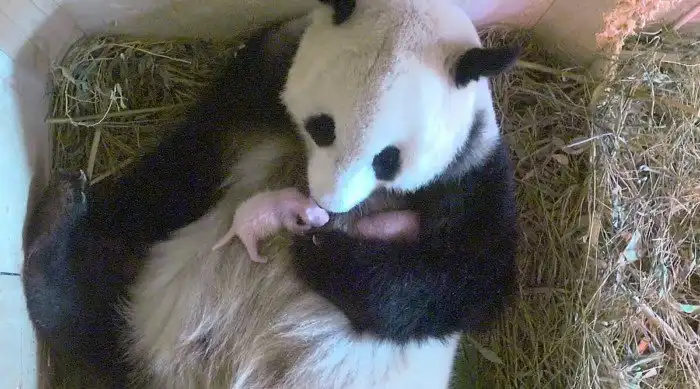 Пандёнок меньше своей родительницы в 900 раз! На этом фото мама кормит детеныша.