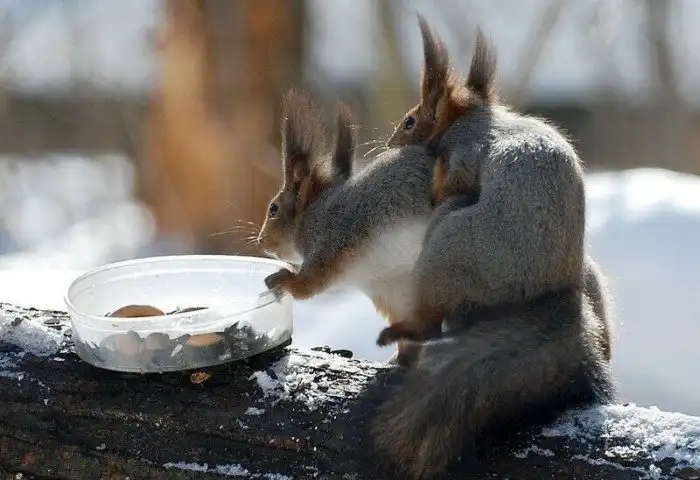 Так как зимой съестного добра нема, хозяйственная животинка сооружает целые амбары с заготовками. Более того, таких кладовых у белки несколько, и все они расположены в разных местах. Грызун знает, что любителей халявы в лесу много, поэтому если один из тайников разграбят, все остальные останутся в целости и сохранности. Но и сама белка не обделена бандитскими качествами. Свой рацион наша героиня разбавляет... мясом.