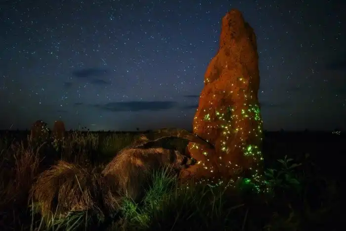 Заброшенные термитники становятся домом для других насекомых. Так личинки огненосных жуков-щелкунов, поселившихся в небоскрёбе, превращают термитники в настоящие мерцающие башни!