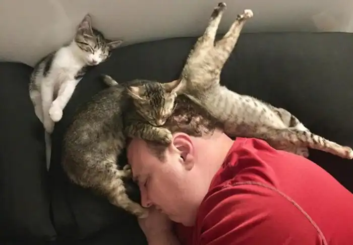 2) Хозяин вписывается в кошачью иерархию как самый топовый кот. Находиться рядом с вожаком — честь для кошки любых размеров, вот и домашняя стремится засыпать рядом с главным парнем своего района или, по крайне мере, квартиры.