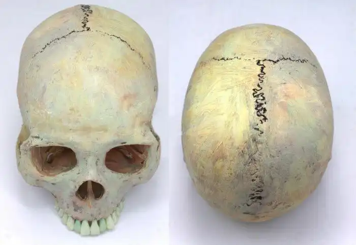 Это череп нашего самого маленького родственника - Homo floresiensis, или "человека-хоббита". Он обитал на островах. Они вырастали всего до 1,1 метра. Он справа!!!