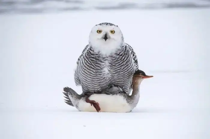 В голодную пору под удар совы попадают не только лемминги. Даже такие крупные животные как зайцы и утки могут стать обедом для этой охотницы.