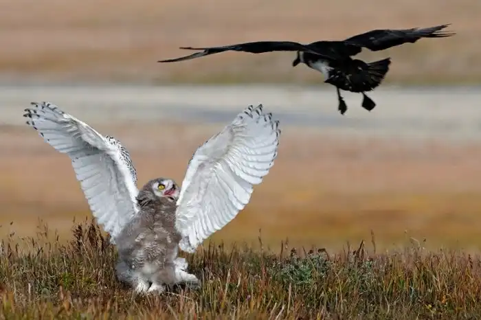 Это быстро просекли гуси, казарки, утки и другие пернатые. Мало того, что здесь их не сожрут, так ещё и потомство их защитят! Полярные совы яростно охраняют свою территорию от песцов — главных охотников за яйцами и птенцами в тундре. Поэтому под защитой находятся не только птенцы совушки, но и птенцы всех тех, кто поселился на её территории.