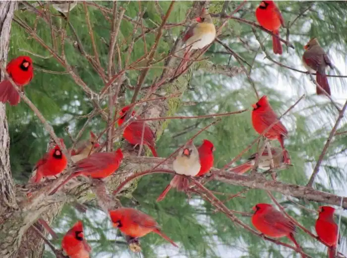 В стаях красных кардиналов можно увидеть только зимой. Всё остальное время птицы друг друга люто ненавидят! Об этом чуть позже.